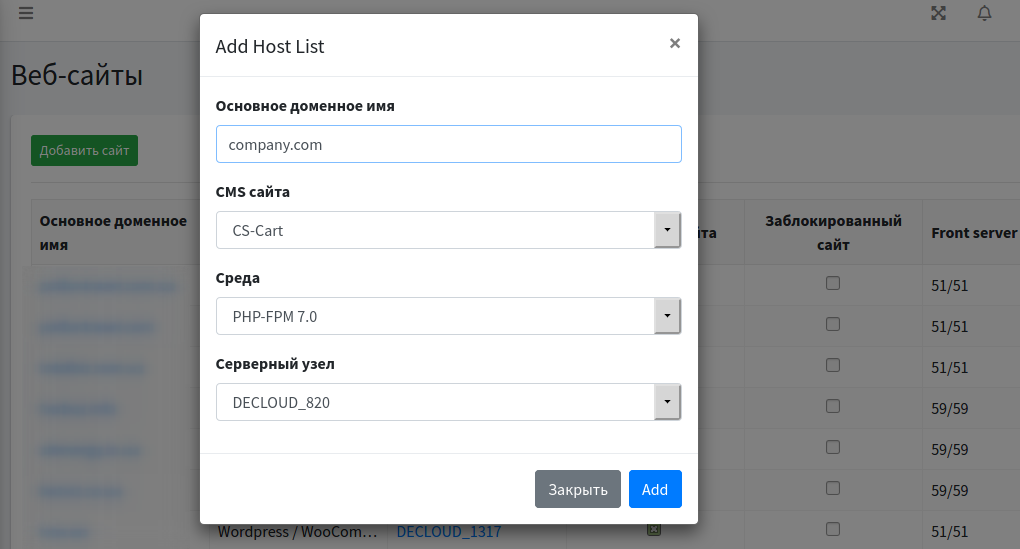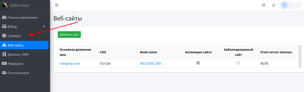 Для добавления сайта в панели управления перейдите в раздел Сайты и нажмите кнопку Добавить сайт.