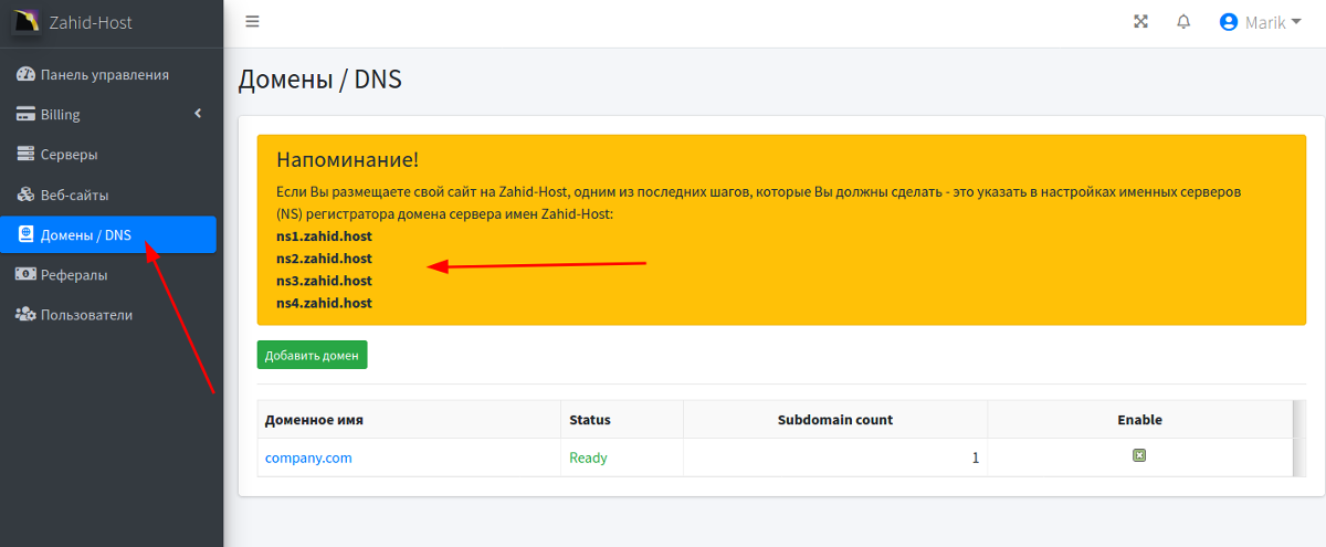 После копирования файлов сайта и миграции базы данных, пришло время прописать в регистратора вашего домена нашы NS-сервера. Список ns-серверов вы найдете в панели управления в разделе Домены/DNS.