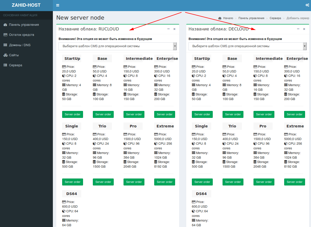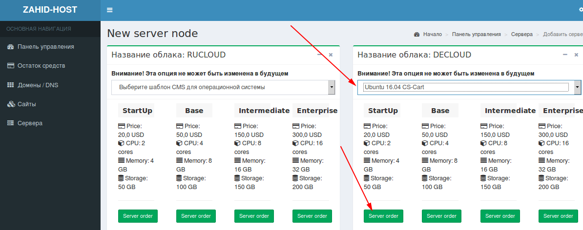 На открывшейся странице будет доступен выбор тарифа хостинга и cms сайта в нужном вам облаке (RUCLOUD или DECLOUD)