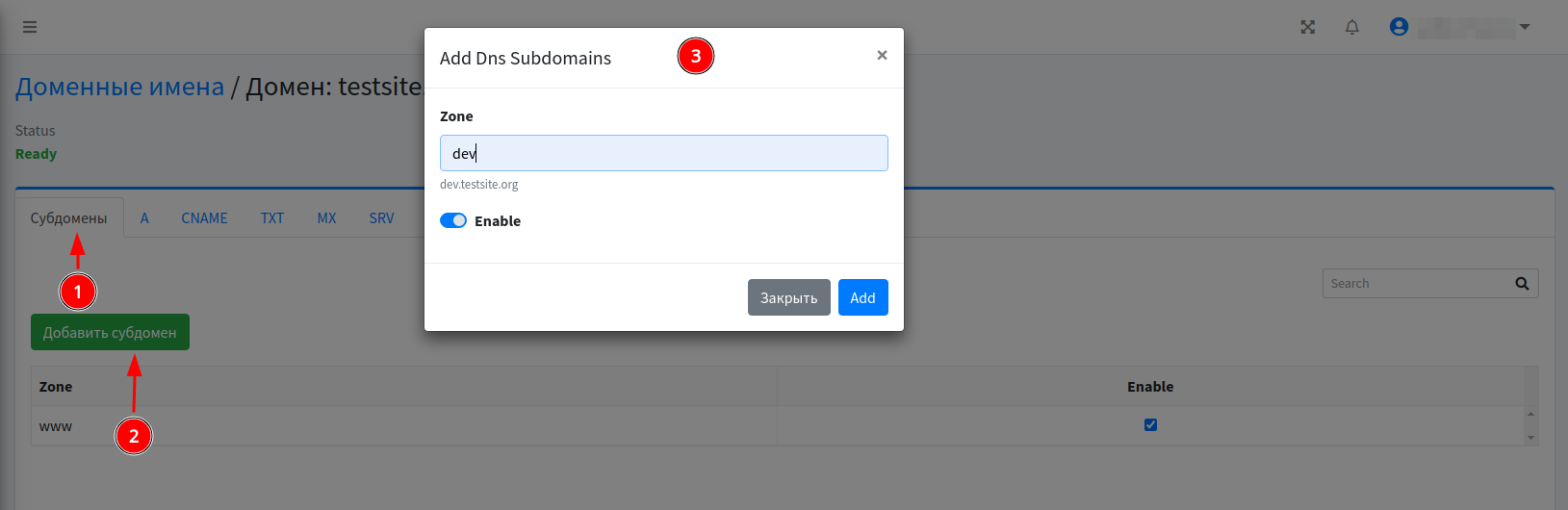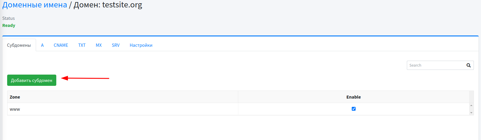 На открывшейся странице вы можете управлять субдоменами сайта. Просто укажите название субдомена и нажмите кнопку «Добавить»