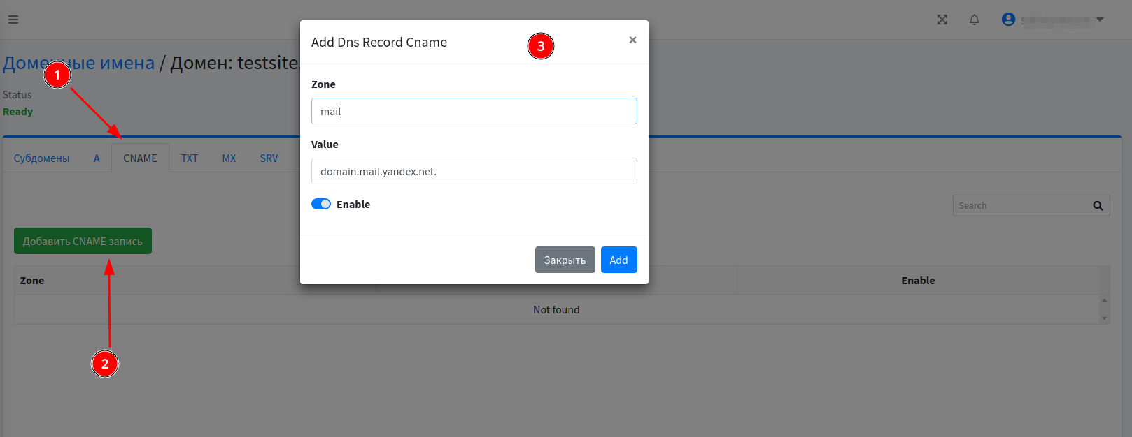 В блоке CNAME записи в поле «Zone» укажите поддомен, для которого добавляется запись, заполните поле «Value» нажмите Добавить.