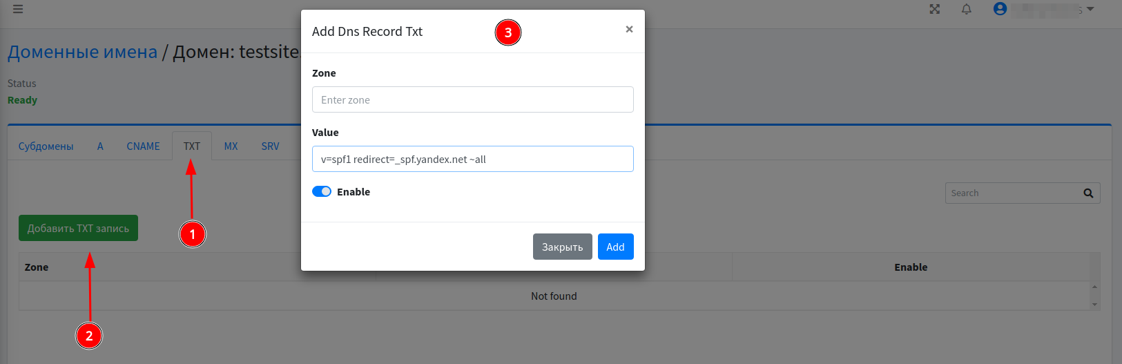 В блоке TXT записи при необходимости добавьте «Zone». В поле «Value» внесите данные TXT-записи и нажмите Add: