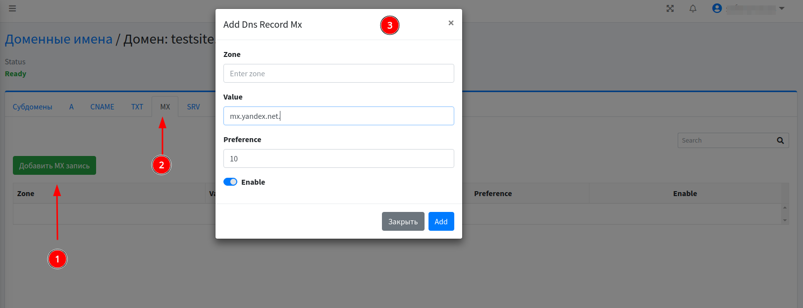 Если запись делается для основного домена (не поддомена) поле «Zone» оставляем пустым. Задайте приоритет в поле «Preference» и нажмите Добавить: