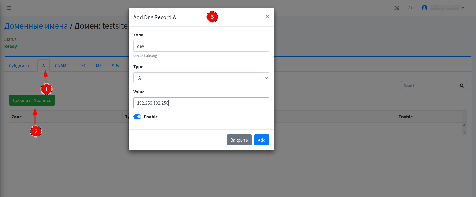 В графе «Zone» введите поддомен (например: dev). В поле «Value» укажите IP-адрес и нажмите Add: