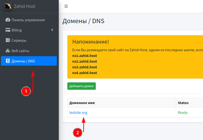 В панели управления выберите раздел «Домены / DNS». Для редактирования нажмите на нужный домен: