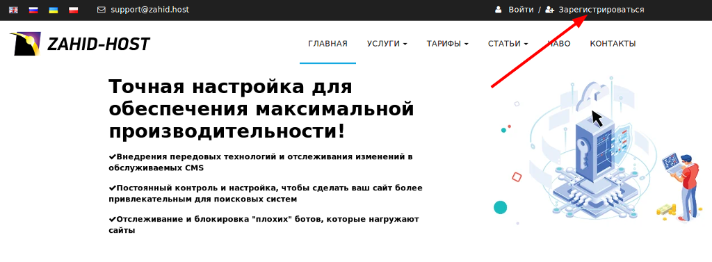 На главной странице сайта Zahid.host нажмите Регистрация в правом верхнем углу.