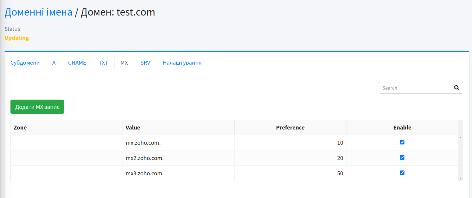 4) Наступним важливим кроком налаштування є MX записи домену. В панелі Zoho будуть запропоновані записи як слід буде внести в розділ Домени / DNS вкладка MX: