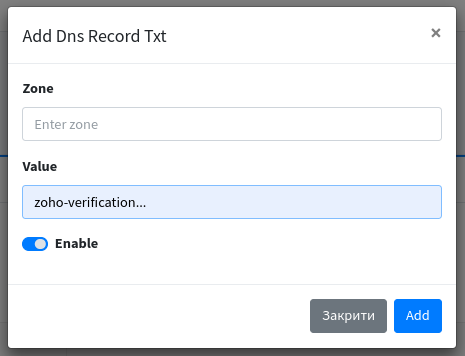 а) Підтвердження TXT записом: Переходимо в розділ Домени / DNS вибираємо необхідний домен та в полі TXT натискаємо "Додати TXT запис". В полі Zone добавте згідно інструкції значення @ або залиште пустим. В полі Value розмістіть значення TXT, згенероване в консолі адміністратора Zoho Mail.