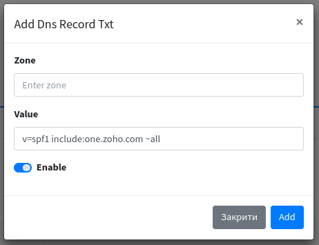 5) Добавляємо запропонований сервісом Zoho, SPF запис на вкладці Домени / DNS вкладка TXT: