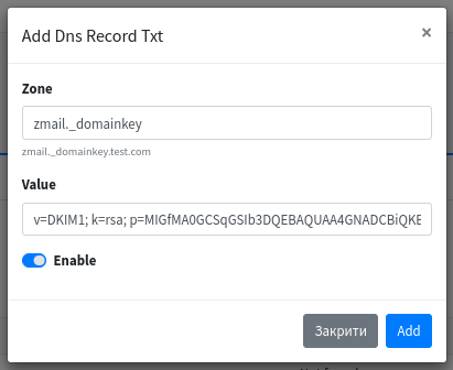 6) В цій же вкладці TXT, добавляємо DKIM запис.