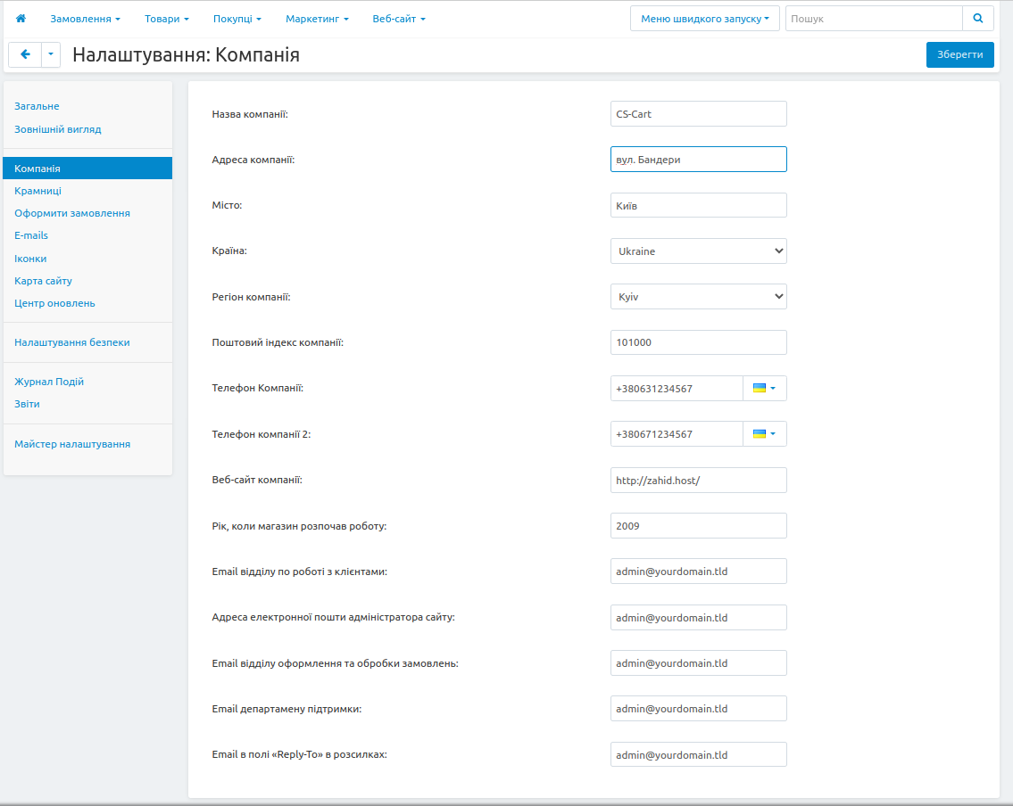 3) Важливим кроком для коректної роботи пошти є заповнення полів ел. пошти на вкладці "Налаштування -> Компанія". Адрес ел. пошти має бути у всіх полях цей сам, що і вказаний вами в полі Ім'я користувача для SMTP: admin@уourdomain.tld