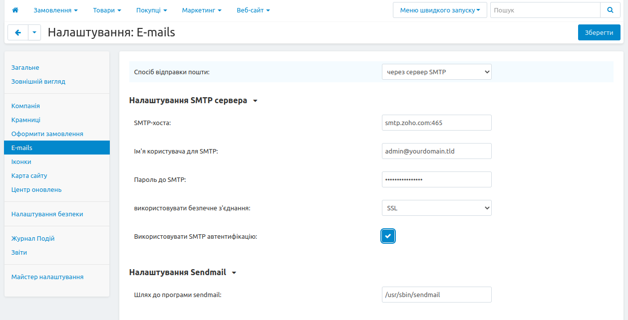1) Входимо в панель адміністратора вашого інтернет магазину, та переходимо на вкладку "Налаштування -> E-mails". Нам відобразяться поля які слід заповнити в наступному вигляді: