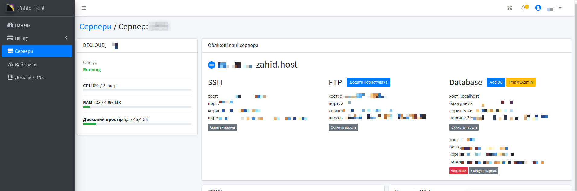 На сторінці сервера надана наступна інформація: SSH, FTP, дані для роботи з базою. До кожного сайту автоматично створюються дані доступу.
